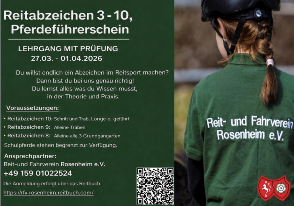 Weitere Informationen zum Lehrgang bekommt ihr unter info@rfv-rosenheim.de. Meldet euch schnell im Reitschulbuch https://rfv-rosenheim.reitbuch.com/ an, denn die Plätze sind begrenzt! 💻📝